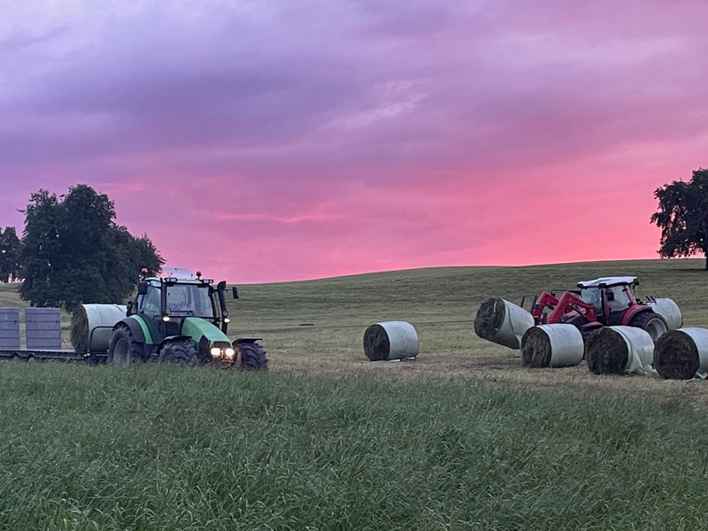 Wir bewirtschaften 32 Hektaren landwirtschaftliche Nutzfläche, wovon 7 Hektaren Ackerbau (Mais, Weizen, Gerste, Kunstwiese) und 5 Hektaren Biodiversitätsförderflächen sind. Zusätzlich pflegen wir 1,8 Hektaren Wald und 60 Obstbäume. Daneben führen wir einen kleinen Hofladen in Selbstbedienung mit Kalbs- und Schweinefleisch, Rohmilch, Freilandeier, Süssmost, Konfitüre, Honig und Kürbisse. |